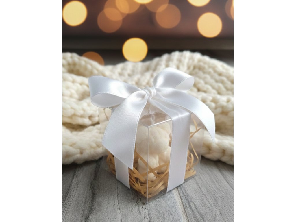 V saténovém sáčku s mašličkou a nebo v transparentní krabičce s výplní a stuhou.