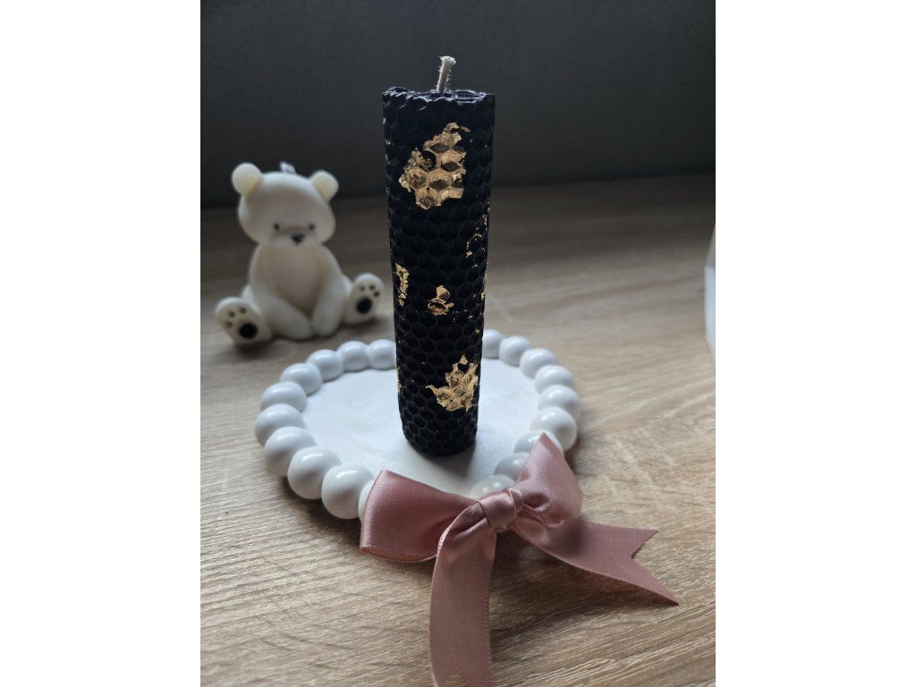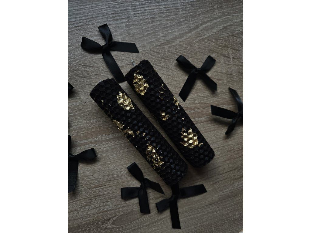 Dopřejte si okamžik absolutního klidu s našimi ručně stáčenými svícemi z prémiového černého včelího vosku. Tato edice spojuje syrovou texturu včelích pláství s opulencí plátkového zlata.