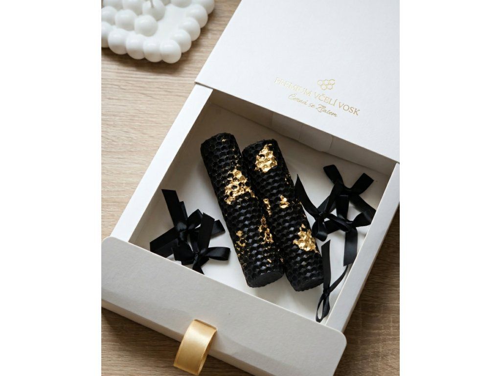 Balení: 2ks včelí svíčky, Elegantní bílý box se saténovými detaily, připravený k okamžitému darování.